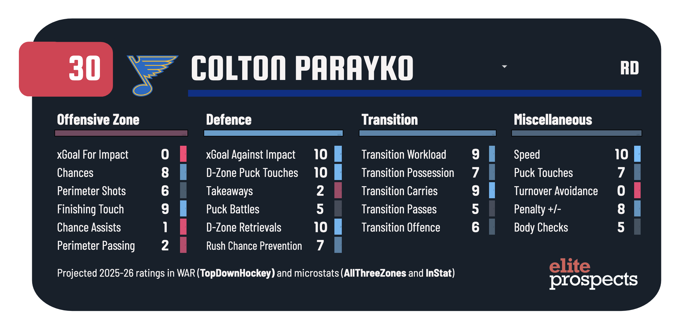 One of the more unique defenders in the league, Colton Parayko's speed, strength, and size have made him a reliable minute-muncher for the Blues in the post-Alex Pietrangelo era as he can absorb a major defensive workload in match-up minutes with a ton of success. Whether he's retrieving loose pucks, clogging lanes, or forcing opponents to the outside, he's a very effective shut-down player. Unfortunately he can tend to have, for lack of. a better term, main character syndrome, taking it upon himself to transport the puck down the ice and jumping up to shoot the puck in the offensive zone, often at inopportune times. These instincts have led him to have surprisingly terrible on-ice offensive impacts as the puck stays out of the hands of the Blues' most dynamic forwards, but there were promising signs after the coaching change and his pairing with Cam Fowler that they can be mitigated without losing the dominant defensive impacts.