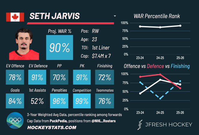 Making the right play at the right time, going to the net, working the walls, forechecking hard, and making plays to space, Jarvis is turning into one of the best wingers in the NHL and one of the league’s top play-drivers. His impact extends to all three zones and his motor stands out every shift.
