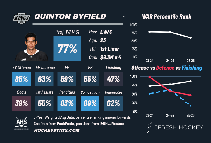 So far, Byfield’s offence has been more muted at the NHL level. On the surface, it may seem like the concern was validated. He does lack some finishing and playmaking precision, but it’s still too early to make a final judgment on his potential.