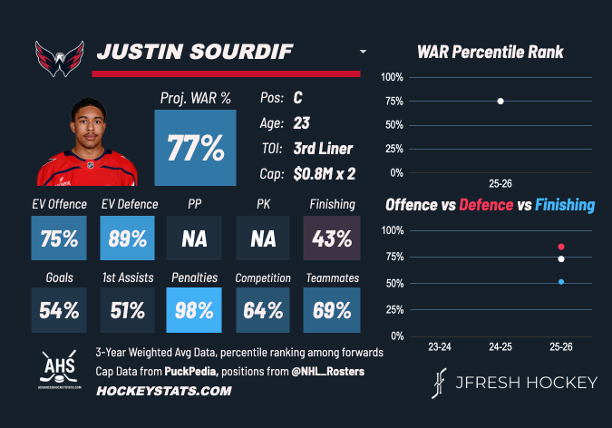 A player in search of an identity in 2020, we struggled to evaluate and project Sourdif, seeing him more as a low-certainty, top-nine shooter than a two-way player. His post-draft development changed the course of his career, leading to his role with the Caps.