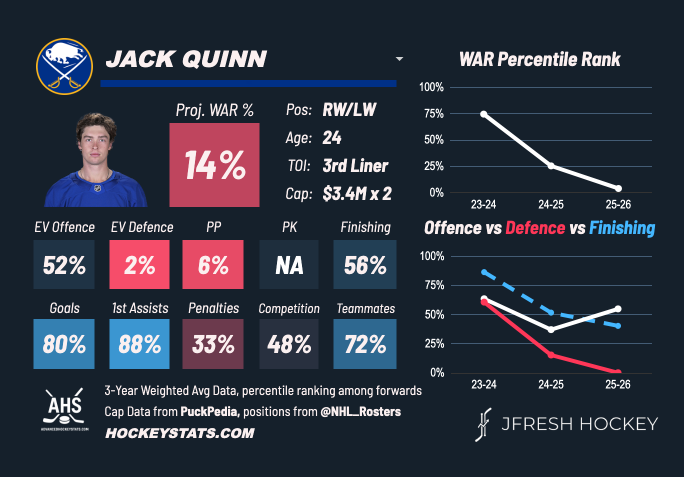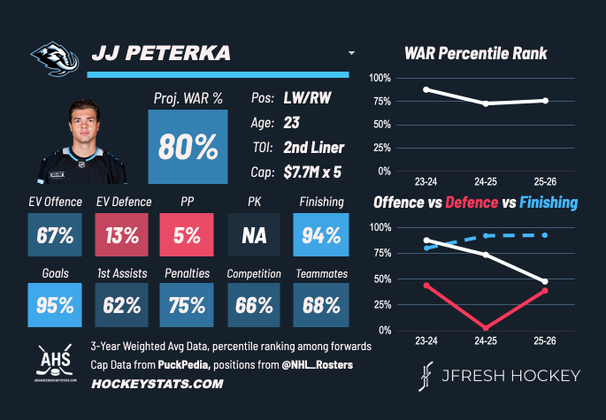 One could easily make a case to push J.J. Peterka up this list. He’s producing more than some of the other players ahead and his underlying numbers also look more favourable in 2025-26. But we do have some reservations about his play.